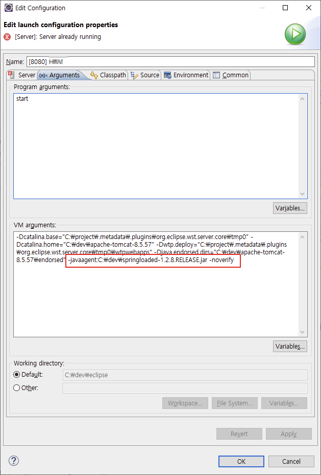 -javaagent:C:\dev\springloaded-1.2.8.RELEASE.jar -noverify
